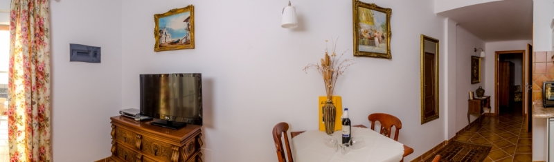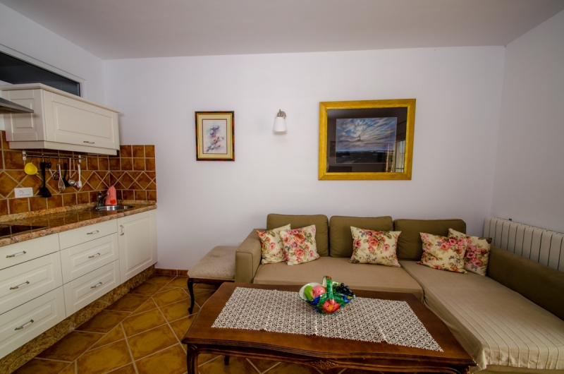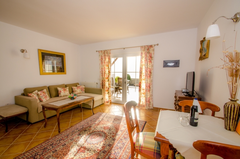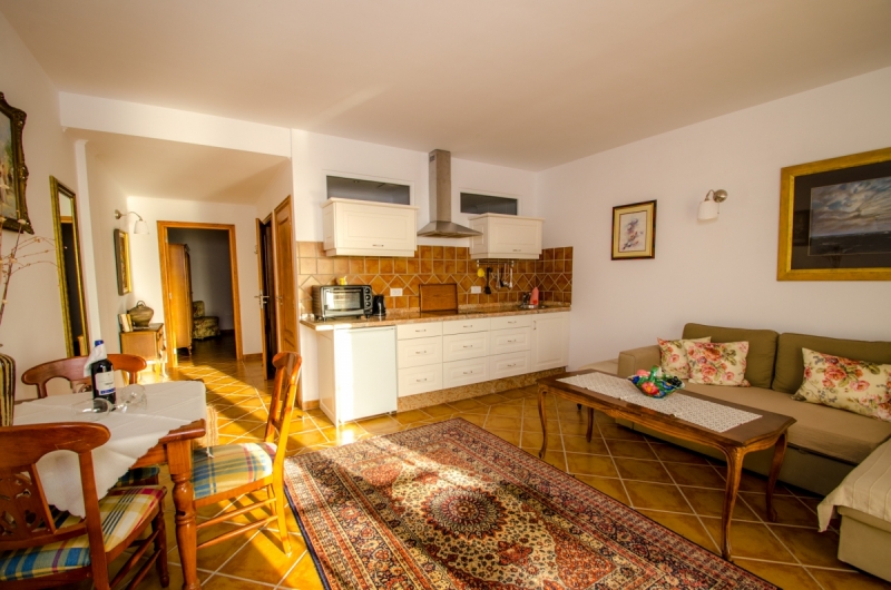 Die Toilette ist nebenan separat in einem Extraraum. In der Wohnküche finden Sie eine gut ausgestattete Küche vor mit Ceranfeld, Kühlschrank, Kaffeemaschine, Toaster, Teekocher und kleinem Backofen, sowie genügend Geschirr, Porzellan,Gläser und Besteck. Auch Gewürze sind vorhanden. Gegenüber der gemütlichen Ausziehcouch ( 140x200) steht ein modernes TV -Gerät mit deutschen Programmen und nebenan ein kleiner Tisch, falls man draussen auf der Terrasse wetterbedingt nicht sitzen kann.